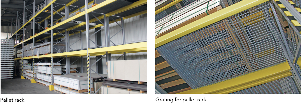The pallet rack can be designed and configured for any length (load up to 30’000?kg/m). A hot-dip galvanised version is available for indoor and outdoor use, as well as a more cost-effective painted or powder-coated version. Our product range also has a comprehensive range of accessories such as collision guards and push-through guards.
