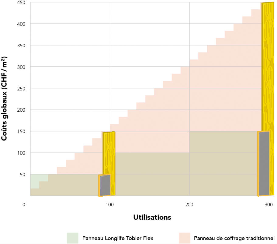 Un panneau de coffrage traditionnel peut être utilisé environ une dizaine de fois avant de devoir être remplacé. Et ce, pour un coût d’environ CHF 15.– / m².