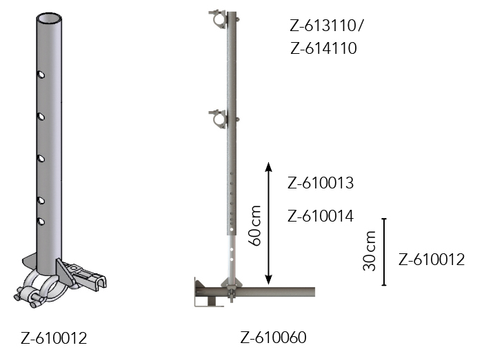 Les consoles sont montées à une distance de 2 à 3,20 m, selon la maçonnerie. Seuls des tubes d’échafaudage de Ø 48,3 mm ou des éléments porteurs en aluminium peuvent être utilisés comme garde-corps.